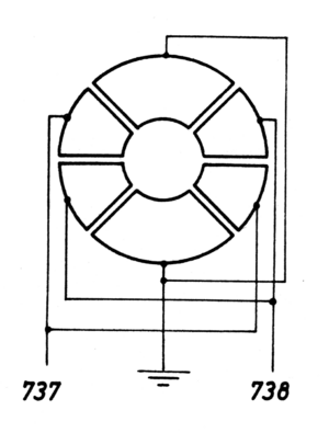 This Stigmator is the type originally designed by O. Rang and has 3 sets of electrodes arranged radially around a central bore. 1 set has a span of 90° and 2 sets have a span of 45°. The 90° segments are usually connected to ground, and the 2 sets of 45° segments connected to bipolar power supplies, changing the polarity and the voltage of these segment sets allows the creation of a continually rotatable and amplitude adjustable electrostatic cylinder lens. This type of Stigmator was first implemented in the AEG / Zeiss EM8 which allowed this machine to reach the highest resolution achieved at the time.